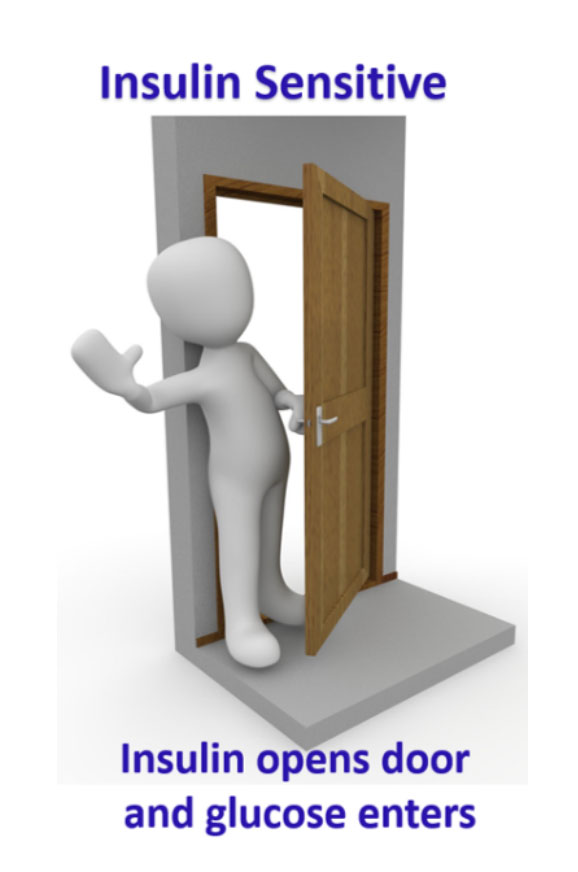 When this happens, glucose can no longer effectively enter through the door into our cells. The reason being that the function of insulin is impaired (door is closing).