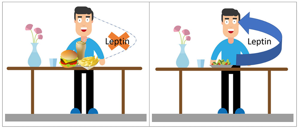 Sugar and starch are both powerful appetite stimulants. That means, by inhibiting the hormone Leptin (the feel-full hormone), they tell the brain that we need to eat more. On the other hand, protein and fat do the opposite. Through the hormone Leptin, they send a signal to the brain to stop over-eating.